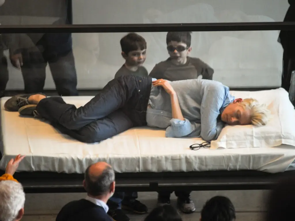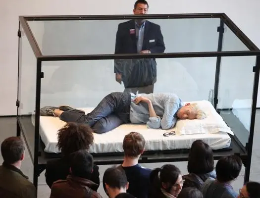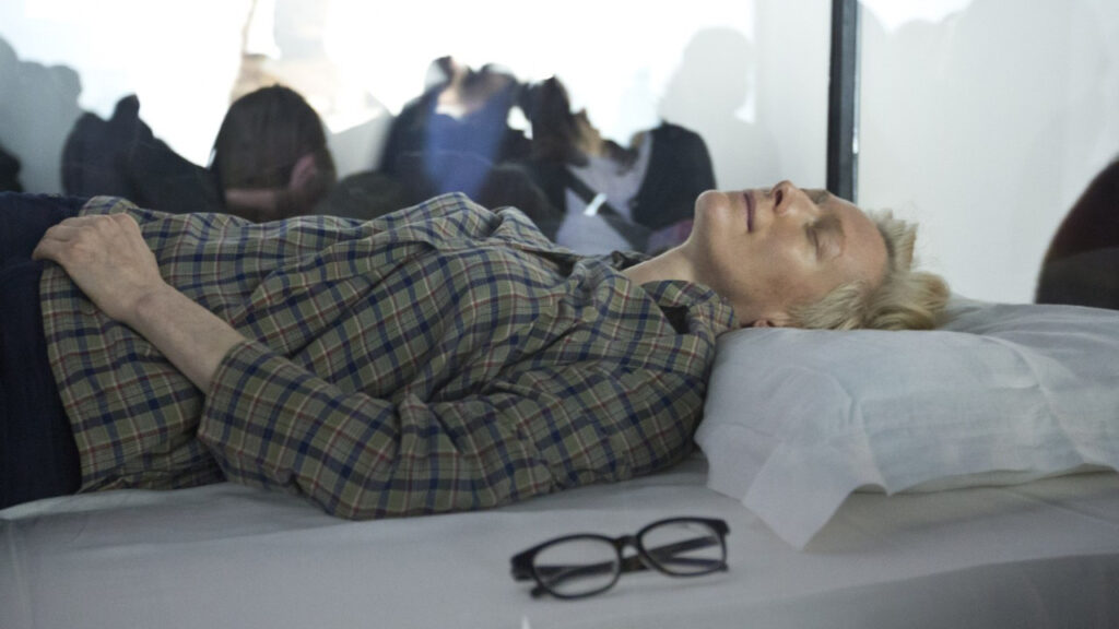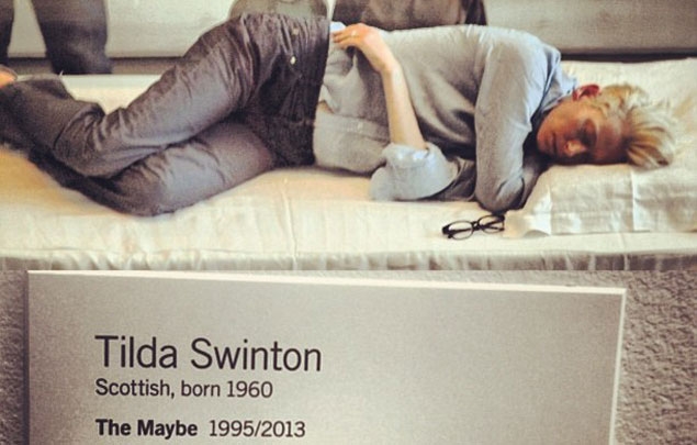 Еден од најчудните/најинтересните/најбизарните/нај/нај/нај… настани, како сакате насловете го, се случи пред десетина години во њујоршкиот Музеј на современа уметност (МоМА), кога познатата актерка Тилда Свинтон реши јавно да спие, пред публиката, реализирајќи го проектот насловен „The Maybe“. Во оваа инсталација, Свинтон спиеше во стаклена кутија по шест-седум часа на ден, нудејќи интимно искуство во живо кое ги брише границите меѓу јавниот и приватниот живот.