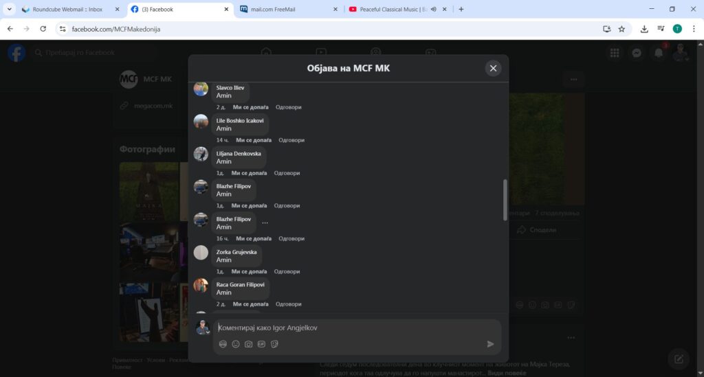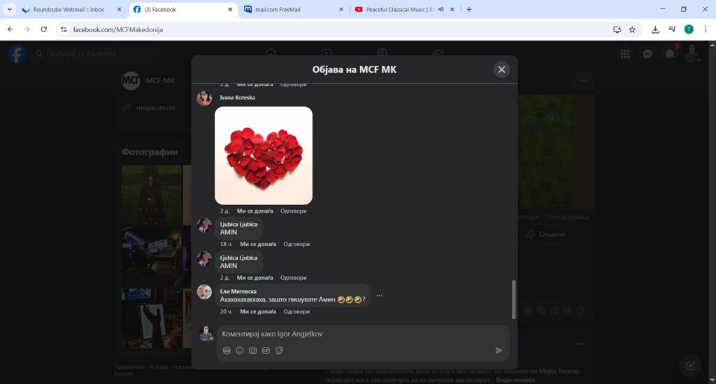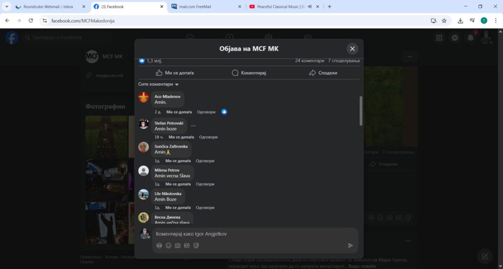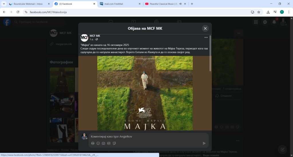 Добро, имаше и по некое срце или цвеќе, не велам не, но „Амин“ доминираше. И таму некаде, при крајот, се појавува извесната Ели, и низ насмевка сосема легитимно прашува „зошто пишувате Амин“? Драга Ели, зошто си распипувач на забави? Зошто си партибрејкер? Па како можеше да напишеш такво нешто, бидејќи после твојот коментар никој не се осмелил веќе да аминува!? Дали си размислила дека со тоа можеби ќе влијаеш врз гледаноста на филмот во нашите кина? Дека ќе ги оставиш празни нашите кино сали? Извини што вината ја насочувам кон тебе, а не кон „верниците“, но иако беше вторник, кога „Синеплекс“ ги продава билетите по акциско-промотивни цени, малата кино сала со број 1 не беше нешто особено исполнета. И сега што!? Па остана во следните 103 минути да се провери што направила режисерката со приказната за една од иконите на 20 век, нашата сограѓанка Гонџа Бојаџиу, попозната како Мајка Тереза.