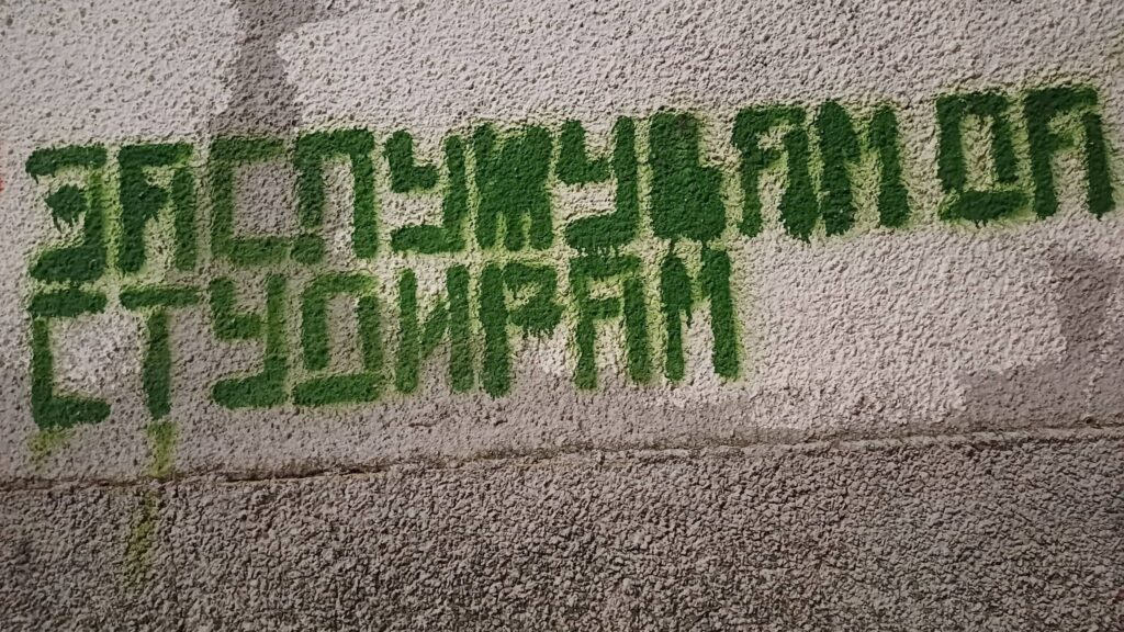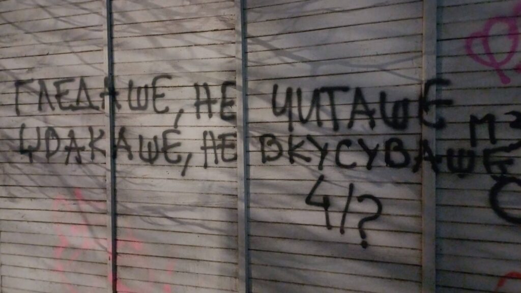 Одамна на овие страници не не’ заплиснале мудростите на скопските графити, но се чини дека дојде време за тоа. Низ 19 селектирани фотографии од Водно преку Центар до Карпош, ова е Скопје за почетници… и идиоти… и „пегли“… извајан од очај и чемер… но и полн со љубов. Ова е Скопје во некоја од можните стварности 😉